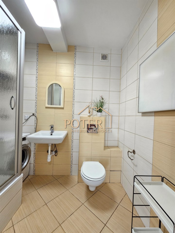- Łazienka z WC, z kabiną prysznicową i pralką