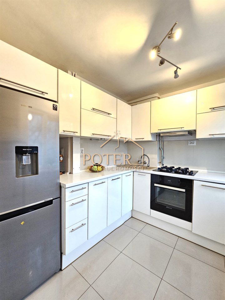 Kuchnia umeblowana, wyposażona w sprzęt AGD (zmywarka, płyta gazowa, lodówka, okap, mikrofalówka)